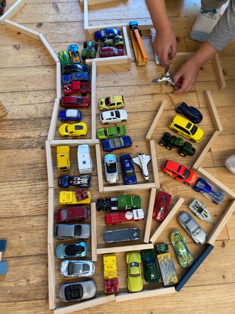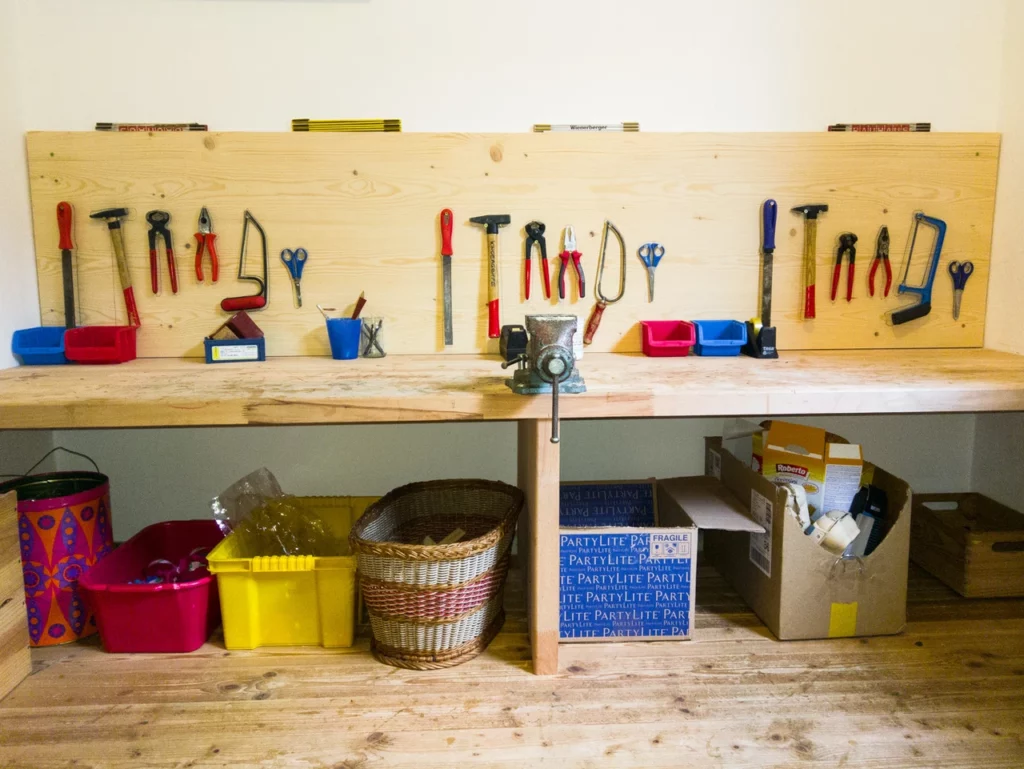 Hier haben die Kinder alles, was sie zum Handwerken brauchen. Werkzeug, das gut funktioniert und für Kinderhände passt: Sie üben den Umgang mit Säge, Feile und Hammer. Dazu gibt es einen reichen Schatz an Materialien: Kartonrollen, Nussschalen, Glitzersteine, Federn, Klebebänder, Korken, Kichererbsen, Stoffstücke, Wolle, …