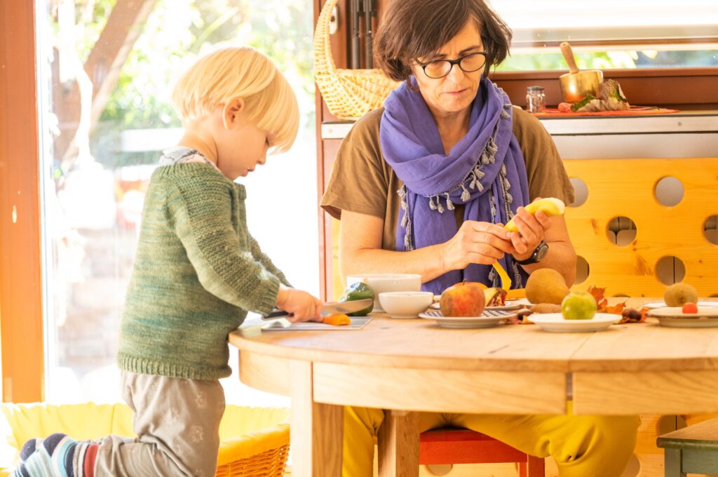 Hier jausnen wir. Es gibt keine festgelegte Jausenzeit, aber täglich bereiten Betreuerinnen und interessierte Kinder ein Jausenangebot für alle zu: Zur „Halbzeitjause“ nach der Hälfte des Vormittags wird der Gong geschlagen. Die eigene, mitgebrachte Jause können die Kinder jederzeit essen. Hier feiern wir auch Feste und Geburtstage gemeinsam.