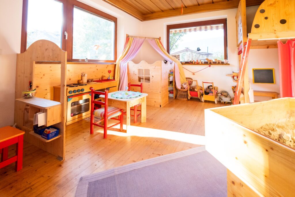 Hier haben die Kinder runde Tische mit Stiften und Papier, Montessori-Material, Bauklötze, Autos, ein Puppenhaus und vieles mehr zur Verfügung. Am großen Panoramafenster kann man sich auf die Fensterbank setzen und die Vögel beim großen Vogelhaus beobachten.