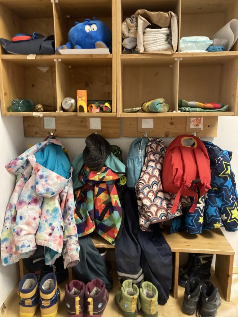 Hier kommen die Kinder an. Jedes Kind hat einen Platz mit drei Fächern, einen Platz für die Schuhe, zwei Garderobenhaken. Die Kinder gestalten selbst ein kleines Schild für ihren Platz.
