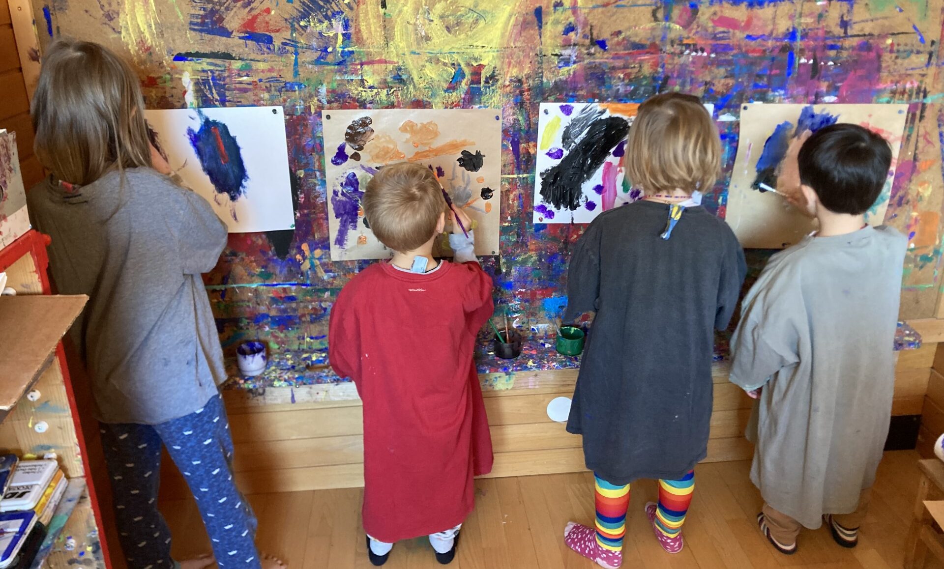Hier gibt es einen Bereich, wo die Kinder stehend malen können. Die Betreuerinnen füllen den Kindern Farbe aus den großen Flaschen in kleinere Becher um. Auch gibt es hier selbst gemachte Knetmasse und eine Bücherecke. Hier erzählen die Betreuerinnen die Geschichte zur Mittagszeit.